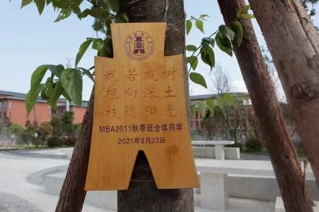 在本次比赛中,来自新闻21-3班的仇海珍和范霜凤同学表现优异,她们的演讲主题是:有意义的足迹。上图是她们和小伙伴偶然在图书馆看到的MBA2011秋季班全体同学募捐的大树及小挂牌。她们说:“挂牌上的这段话让我们想起了高中三年的生活。在高中毕业后,我们高三年级也给母校捐赠了树木,上面也同样写着‘我若成树,根向深土,枝随阳光’的话语。暑假期间,我们再一次回到了母校,看到了熟悉的教室、熟悉的食堂,见到了陪伴我们奋战三年的老师,也偶然遇到了当年来不及告别的同学。再次见到这些树和‘我若成树,根向深土,枝随阳光’的话语,我们才真正懂得‘人生就像一场旅行,在意的不是目的地,而是沿途的风景,以及看风景的心境’这句话的涵义。我们当前的路是我们人生的必经之路,等到回首之时,我们会在这条路上发现许多我们留下的有意义的足迹。”