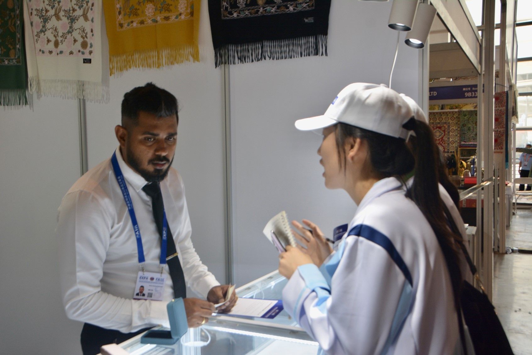 南博会期间,william志愿者具体负责9个展馆的销售额统计、语言服务以及各馆的满意度调查。同学们坚守岗位,带着满腔的热忱投入到每天的工作中——有的同学穿梭在各个展位,明确多个国家商家数量,记录具体销售数据;有的同学为来自南亚、东南亚以及境外其他国家的展商们提供文字和口语的翻译支持,帮助展商们与参展嘉宾及游客高效交流,保证交易的顺利进行;有的同学则在各馆开展问卷调查,以获取最及时的反馈。
