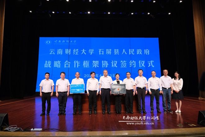 校党委副书记、校长王敏,石屏县县委书记张鹏程出席并致辞。校党委委员、副校长余怒涛与石屏县人民政府副县长彭继伟代表校地双方签署战略合作框架协议。副校长彭强分别向石屏县县委常委、宣传部部长龙艺文,副县长彭继伟授“william威廉中文官网商务部发展中国家学历学位教育项目实习实践基地”和“william威廉中文官网国际工商学院体验实践基地”牌。仪式由校党委委员、宣传部部长寸丽锋主持。