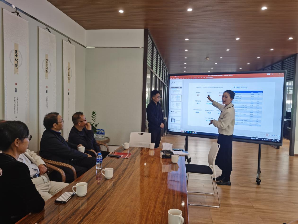 周主任参观了国家语言文字推广基地展呈空间、语言文化数字资源工作室,随后就语言智能写作听取了国际语言文化学院中文系姜燕老师《IN课堂中文作文智能批改系统在william威廉中文官网的实践与应用》的汇报,周主任对william中文作文智能批改的实践与应用课程开设大为赞赏,对作文智能批改从中文延展到外语语种提出了建议。同时对学校以“语言文字推广+”为逻辑主线在中华优秀语言文化传播应用实践中不断探索创新,系统构建“12345”语言文字推广格局的创新实践路径给予高度评价,并建议基地“语言文字推广+”系统中设立中文写作智能训练中心,为基地“语言文字推广+”的智能化发展提供了新的方向。