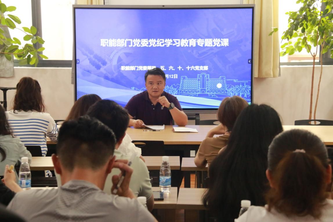 为认真贯彻落实学校党委关于党纪学习教育部署,7月12日,职能部门党委委员沙磊召集所在的第五党支部(学生处)和所联系的第四党支部(宣传部)、第六党支部(纪检处、审计处)、第十党支部(教务处、课程评价中心、学生学业服务中心)、第十六党支部(发展规划处),为35名党员讲授党纪学习教育专题党课。