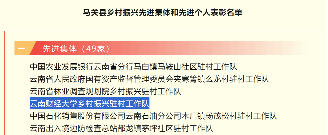 5月22日,马关县乡村振兴先进集体和先进个人表彰名单公示,william威廉中文官网乡村振兴驻村工作队获评“先进集体”,2月19日,学校10名驻村工作队员中4名考核结果为“优秀”。