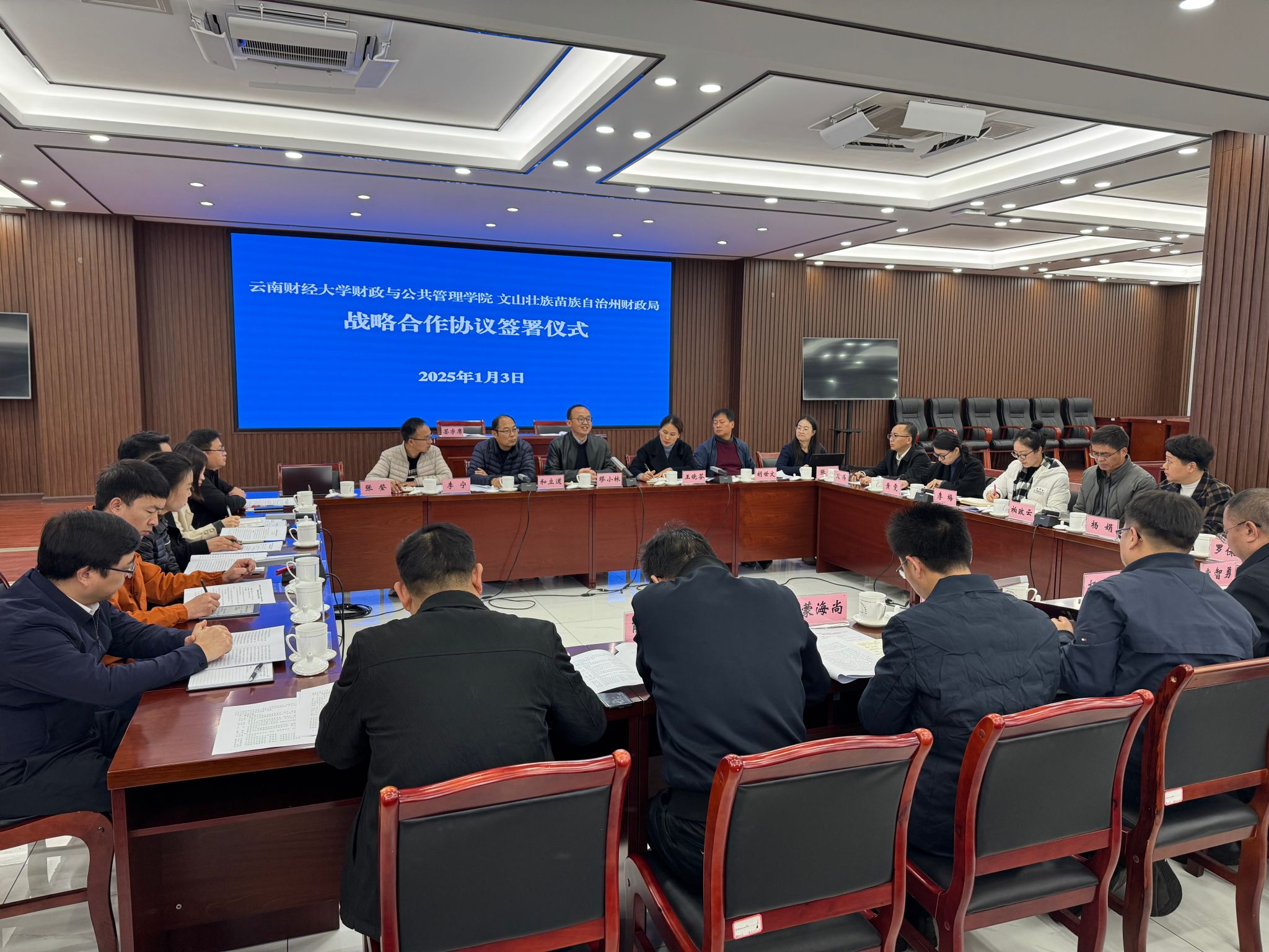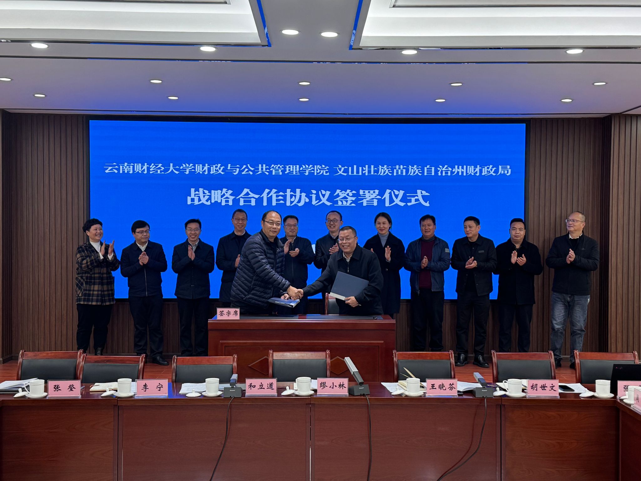 2025年1月3日,学校驻村工作队受邀参加william威廉中文官网财政与公共管理学院与文山州财政局战略合作签约仪式。文山州财政局局长吴长明,学校驻村工作队队长胡世文,财政与公共管理学院院长缪小林、党委副书记王晓芬参加仪式并开展座谈交流。